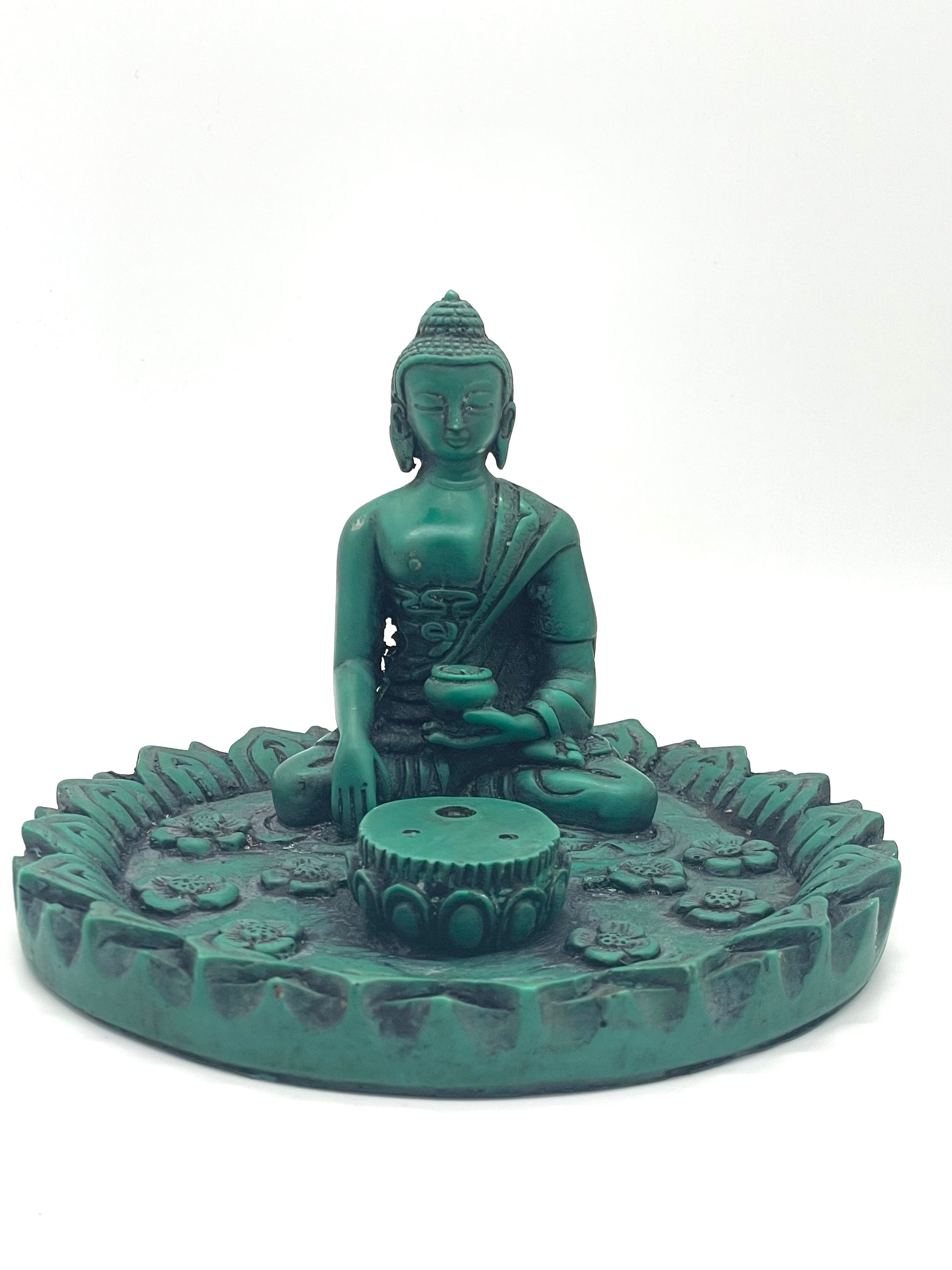 The Buddha sits on the top of the lotus flower plate and three holes in front of the Buddha can hold both types of incense sticks (one with thin wood and other with without wood stick).