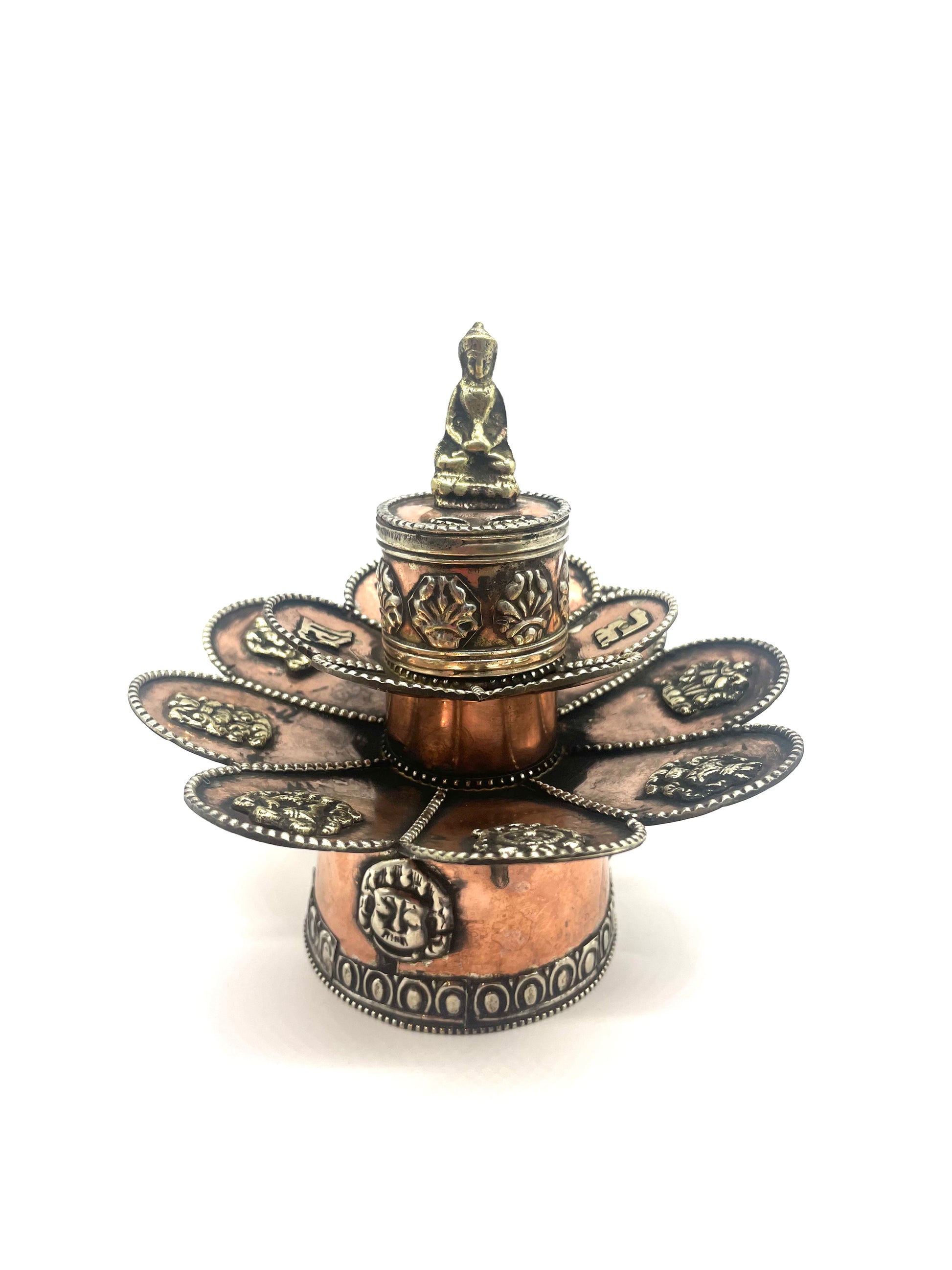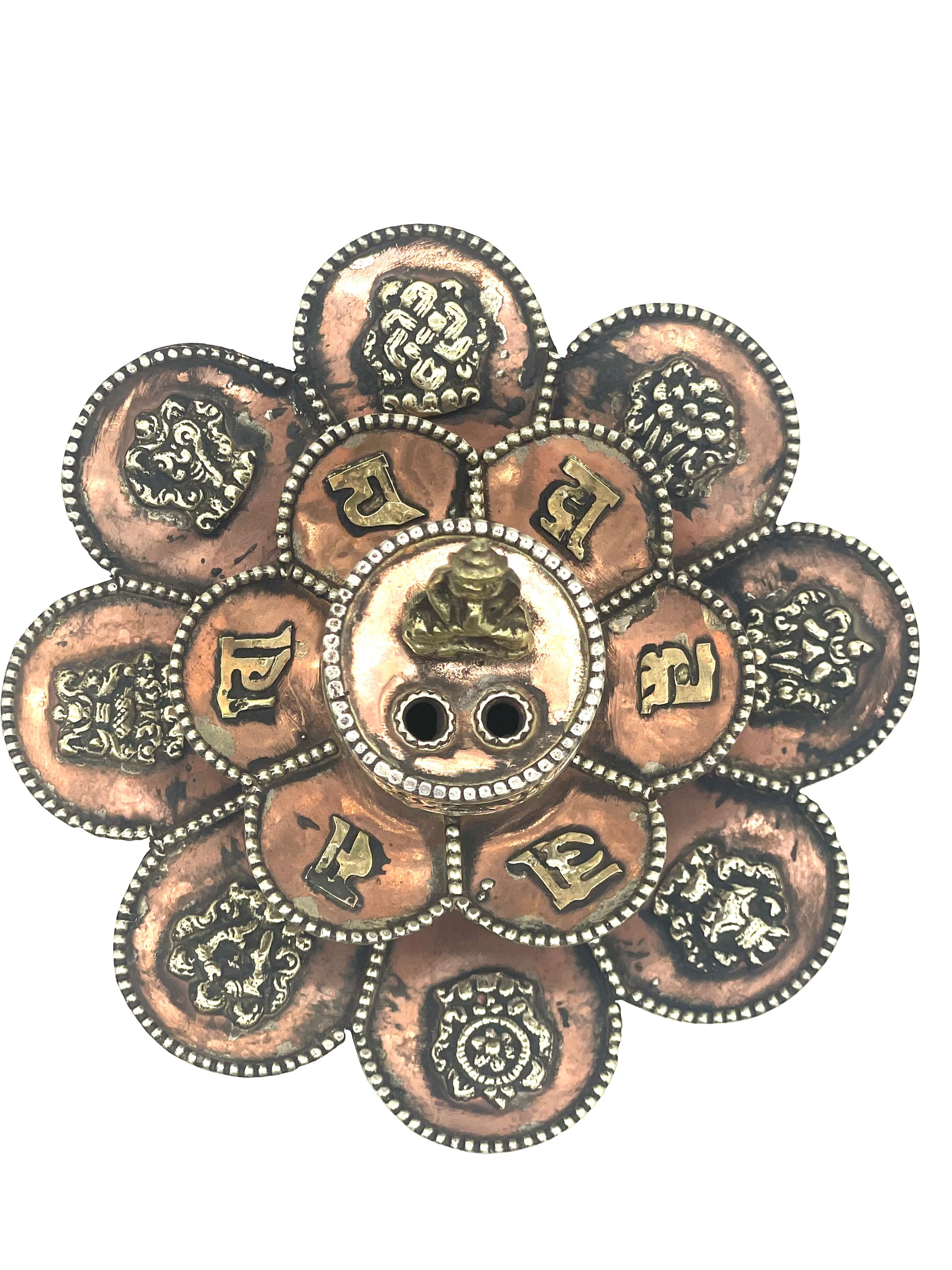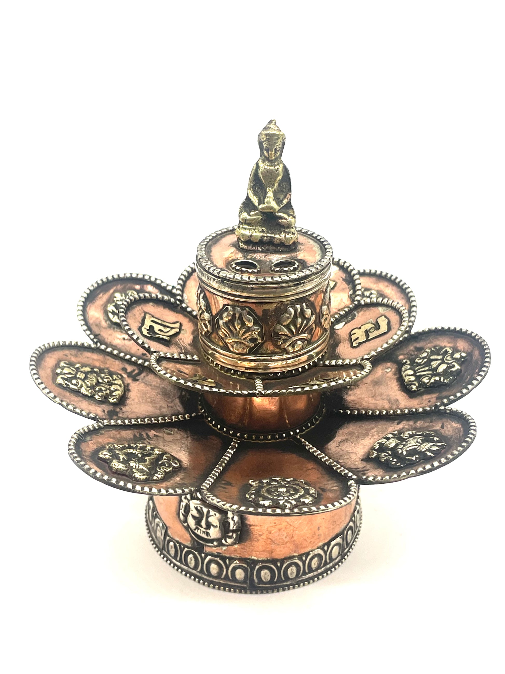 This beautiful cooper incense burner is given the shape of lotus and the petals of the flower finely carved with eight auspicious symbol and Tibetan mantra.