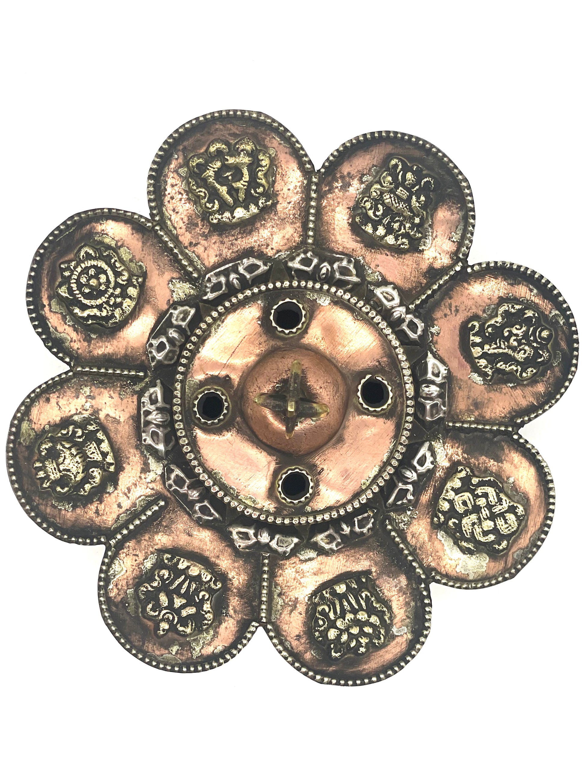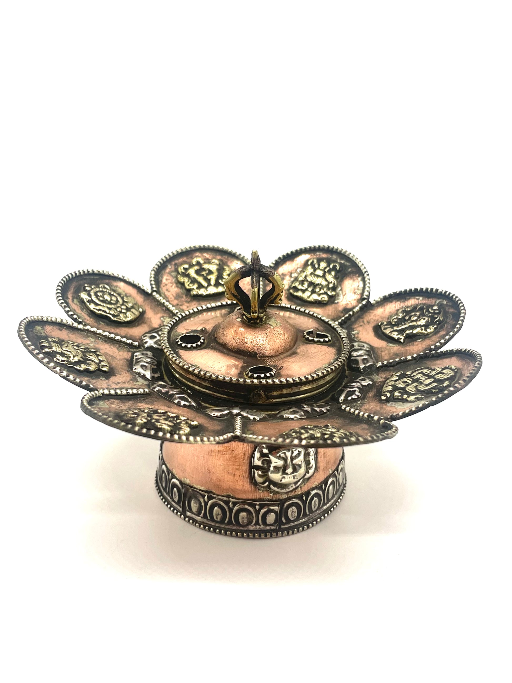 This beautiful cooper incense burner is given the shape of lotus and the petals of the flower finely carved with eight auspicious symbol.