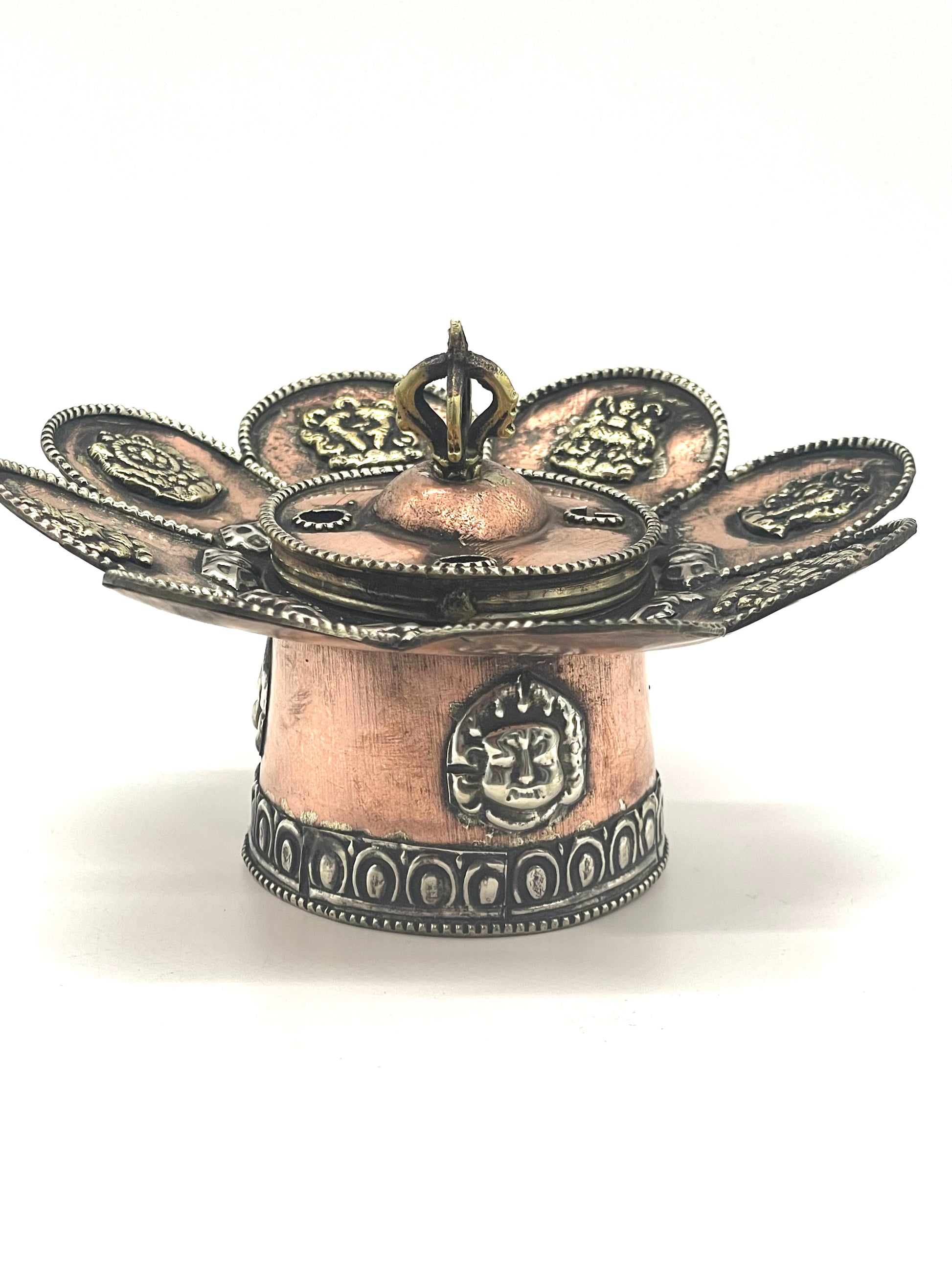 The Vajra sits on the top of the incense burner and four holes around the Vajra is used to hold the incense. The lid on which the Vajra sits can be opened and used as a candle holder as well.