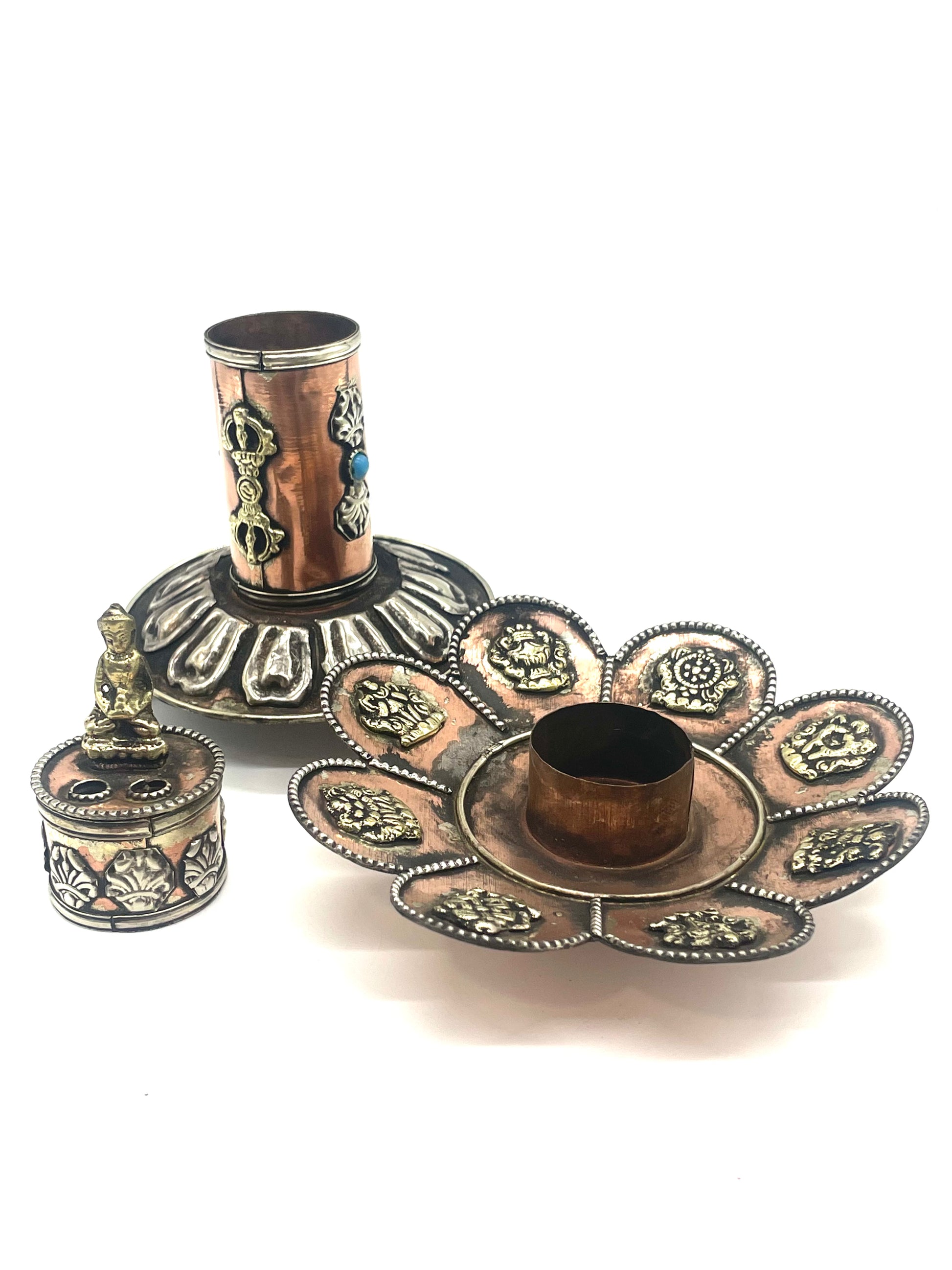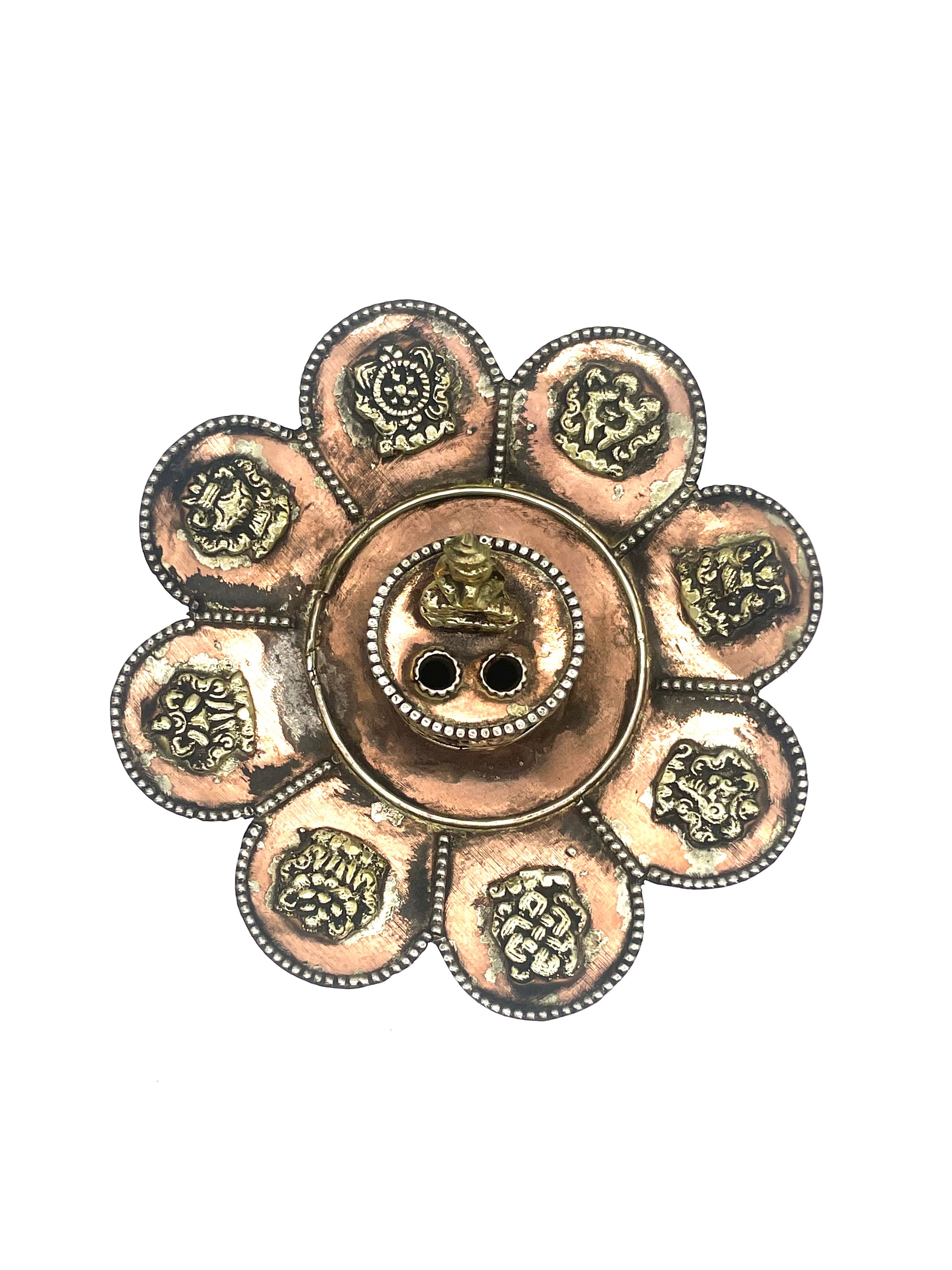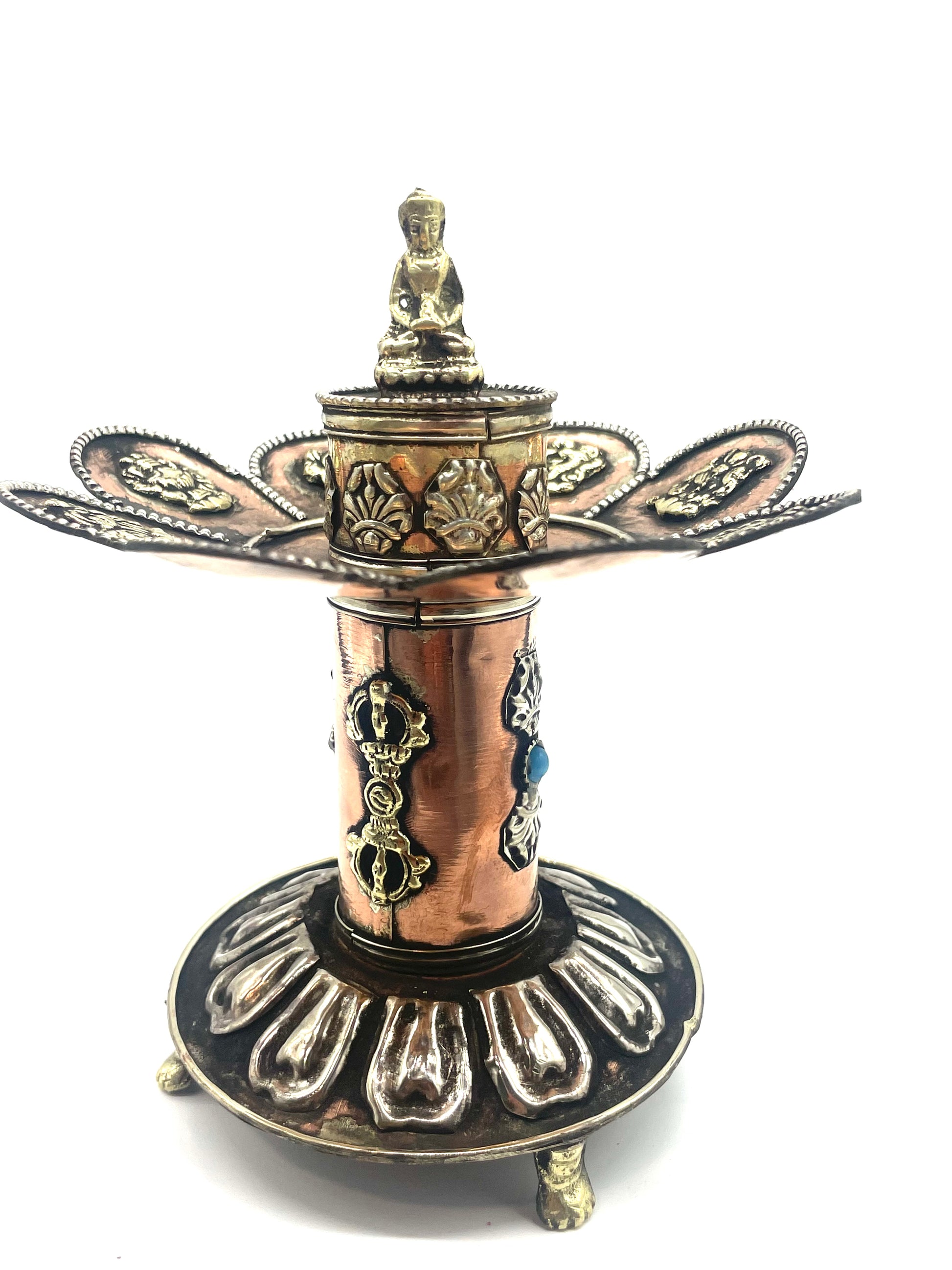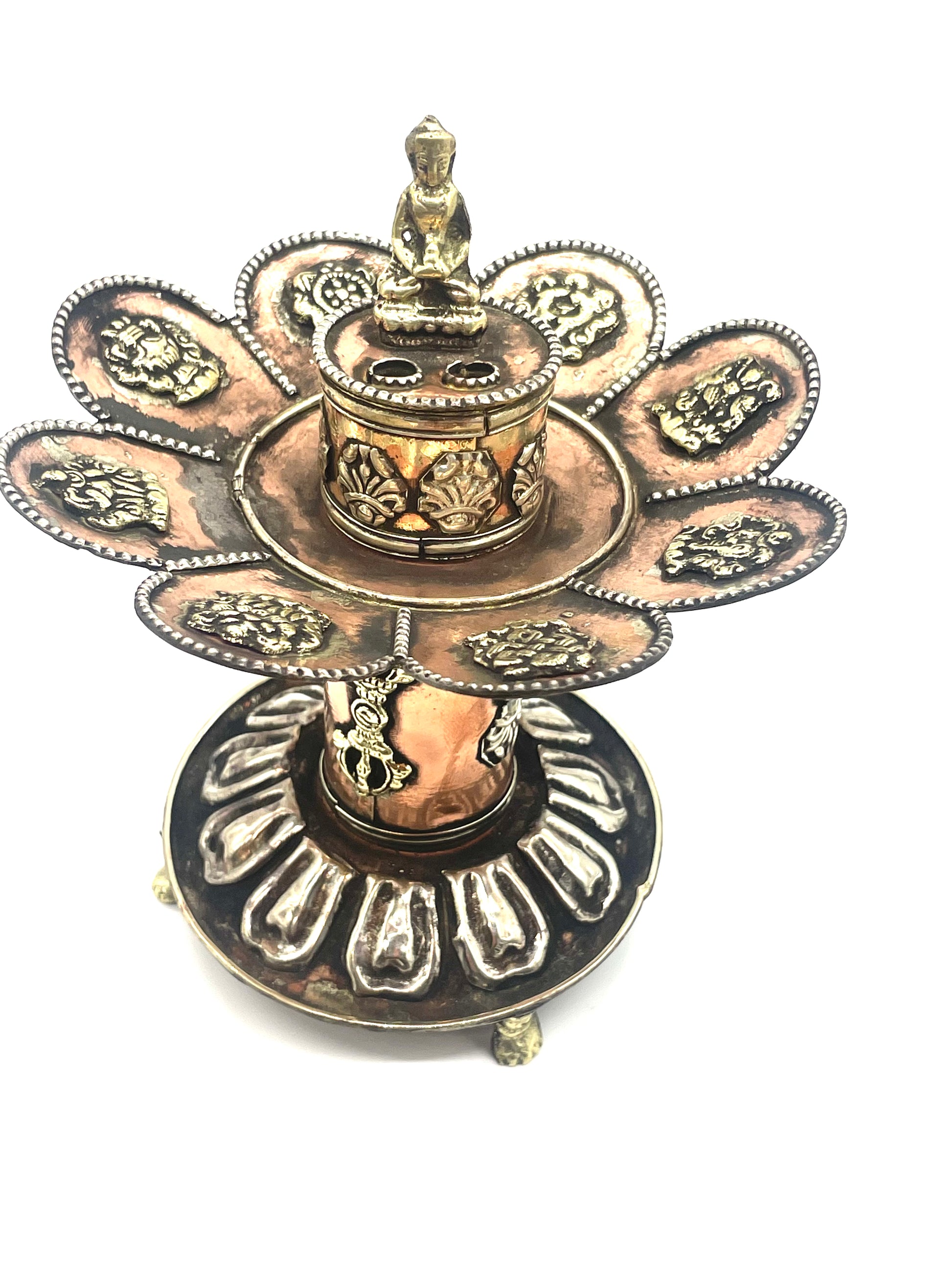 This beautiful cooper incense burner is given the shape of lotus and the petals of the flower finely carved with eight auspicious symbol and the pillar of the incense is carved with Vajra symbol.