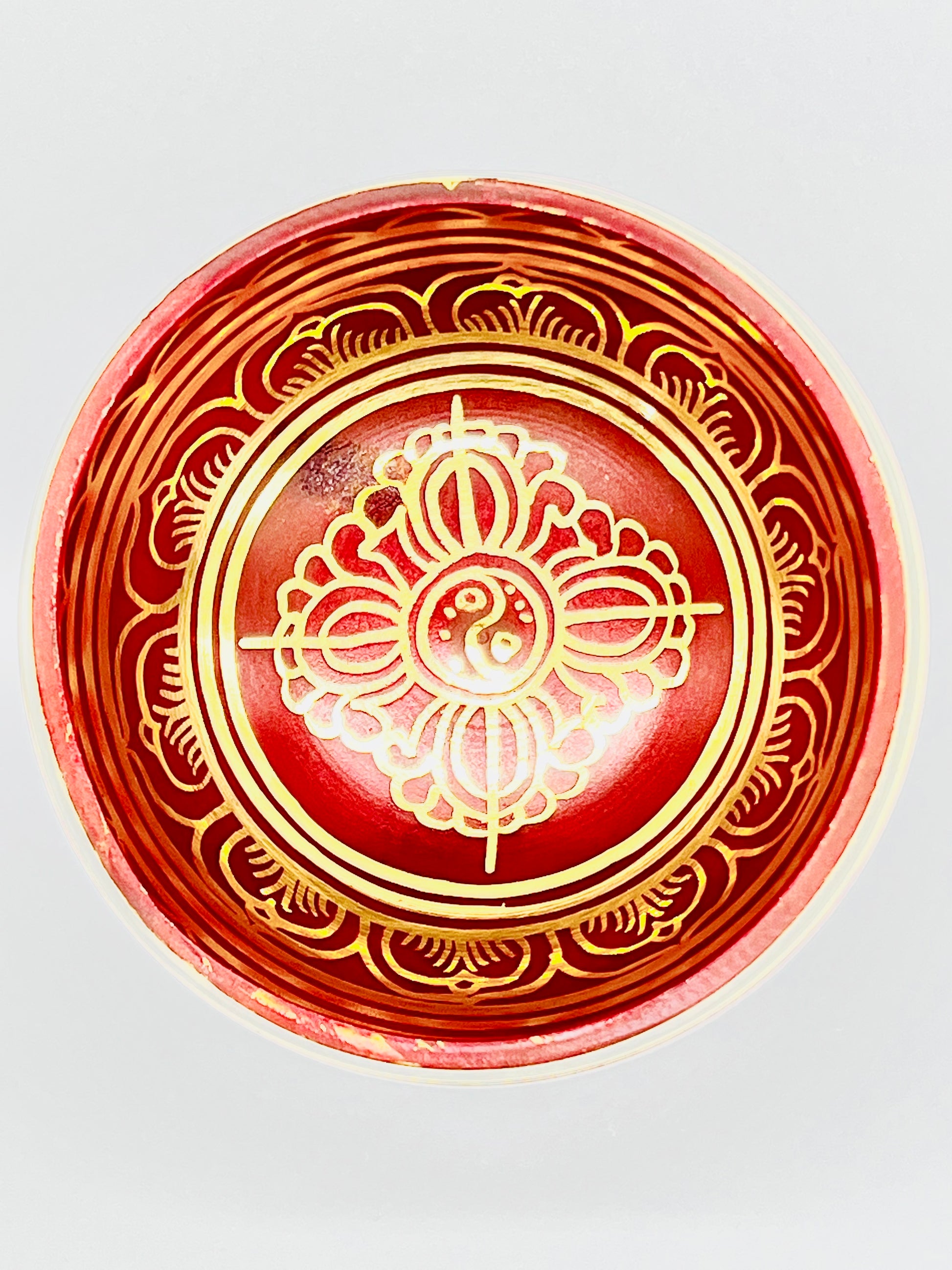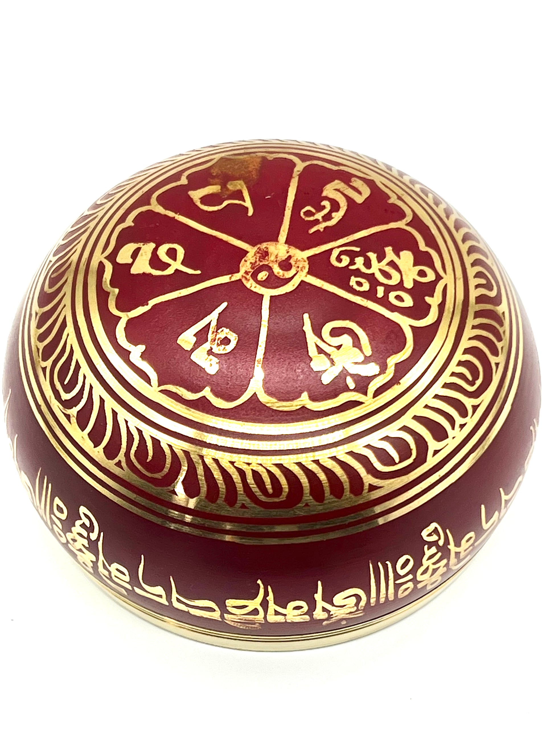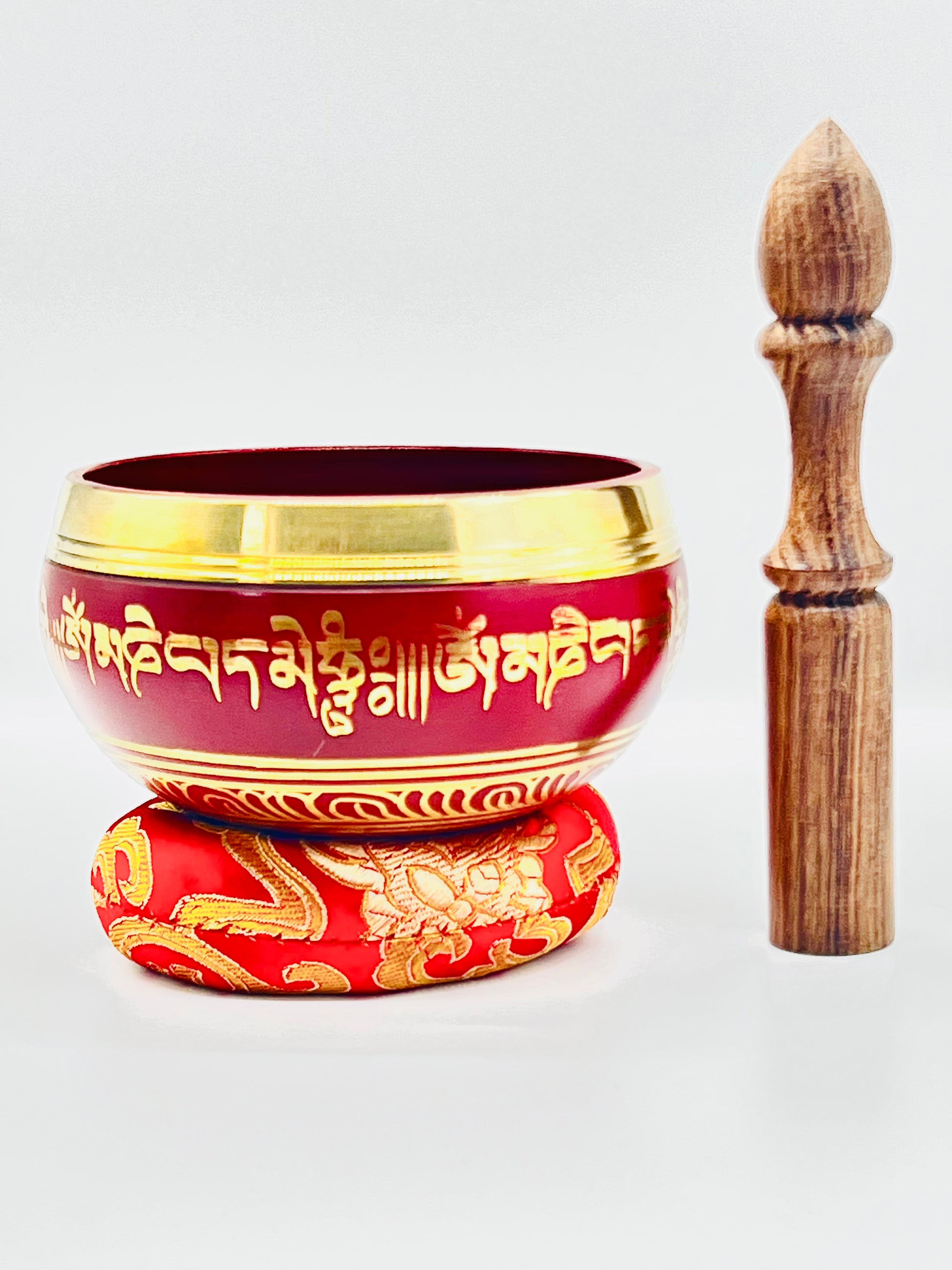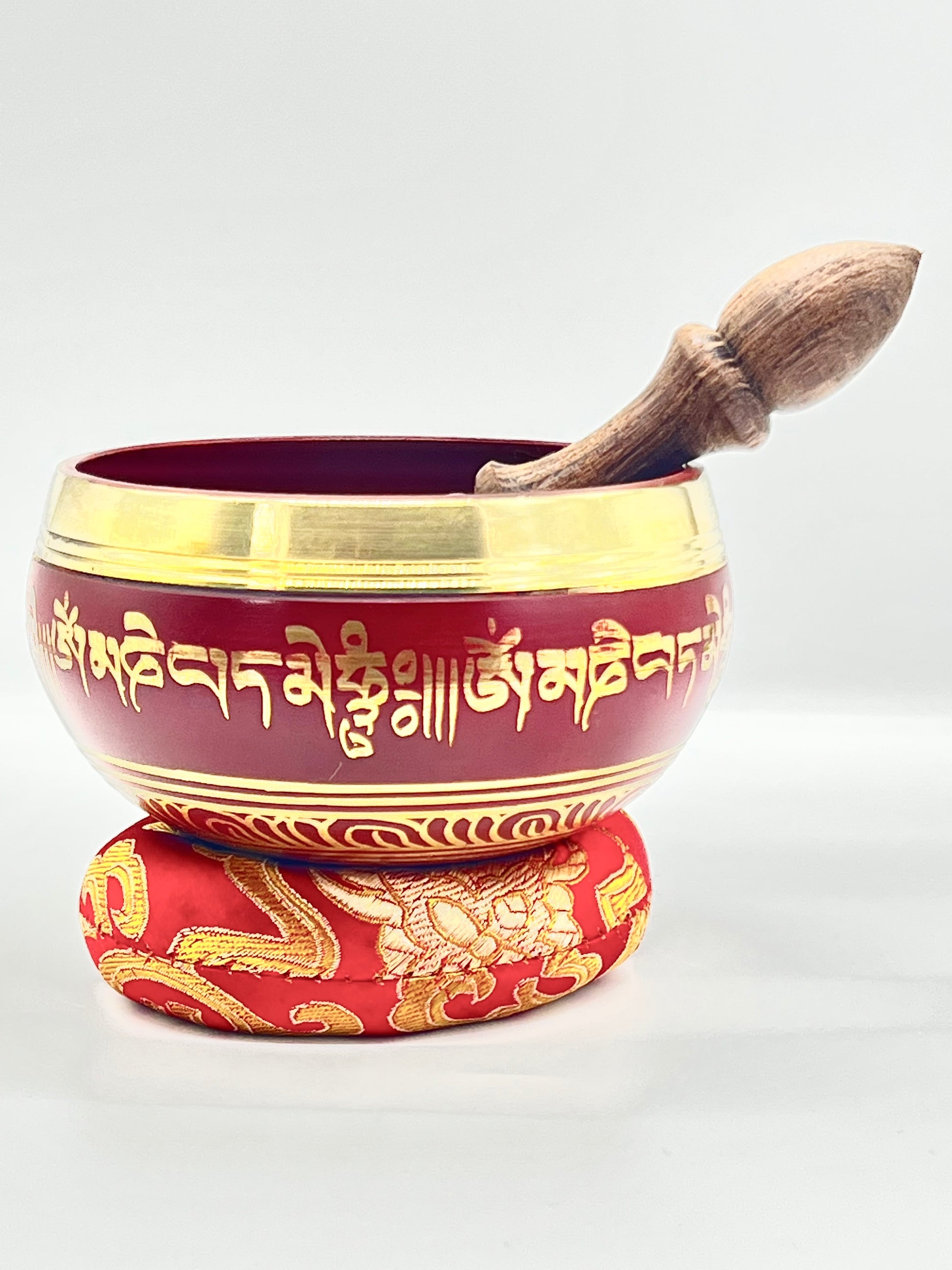 Red hand painted singing bowl with double Dorje syllable inside, Tibetan compassion mantra ( Om mani padme hum) design on the under and Tibetan compassion mantra ( Om mani padme hum) hand painted on outside.