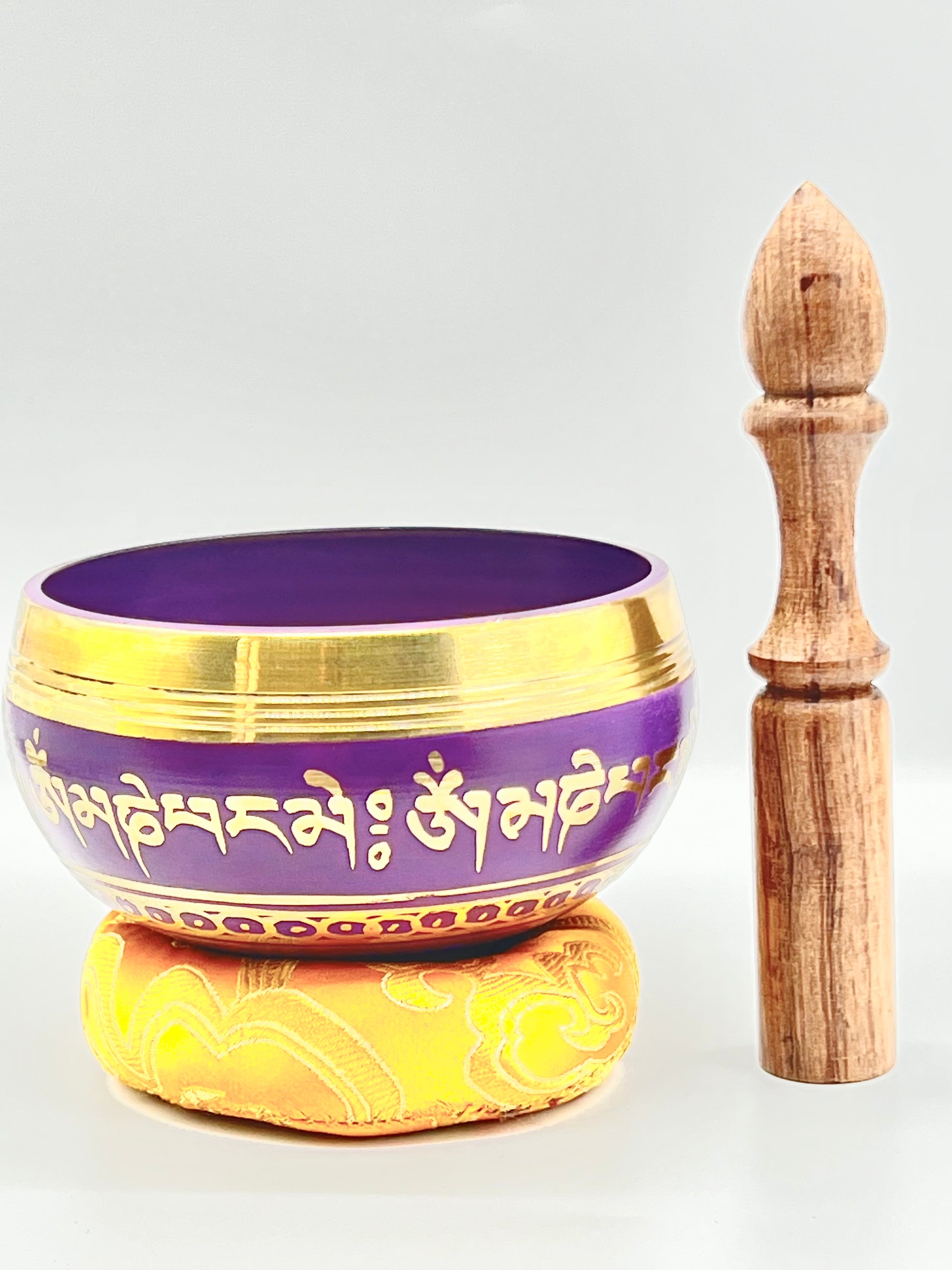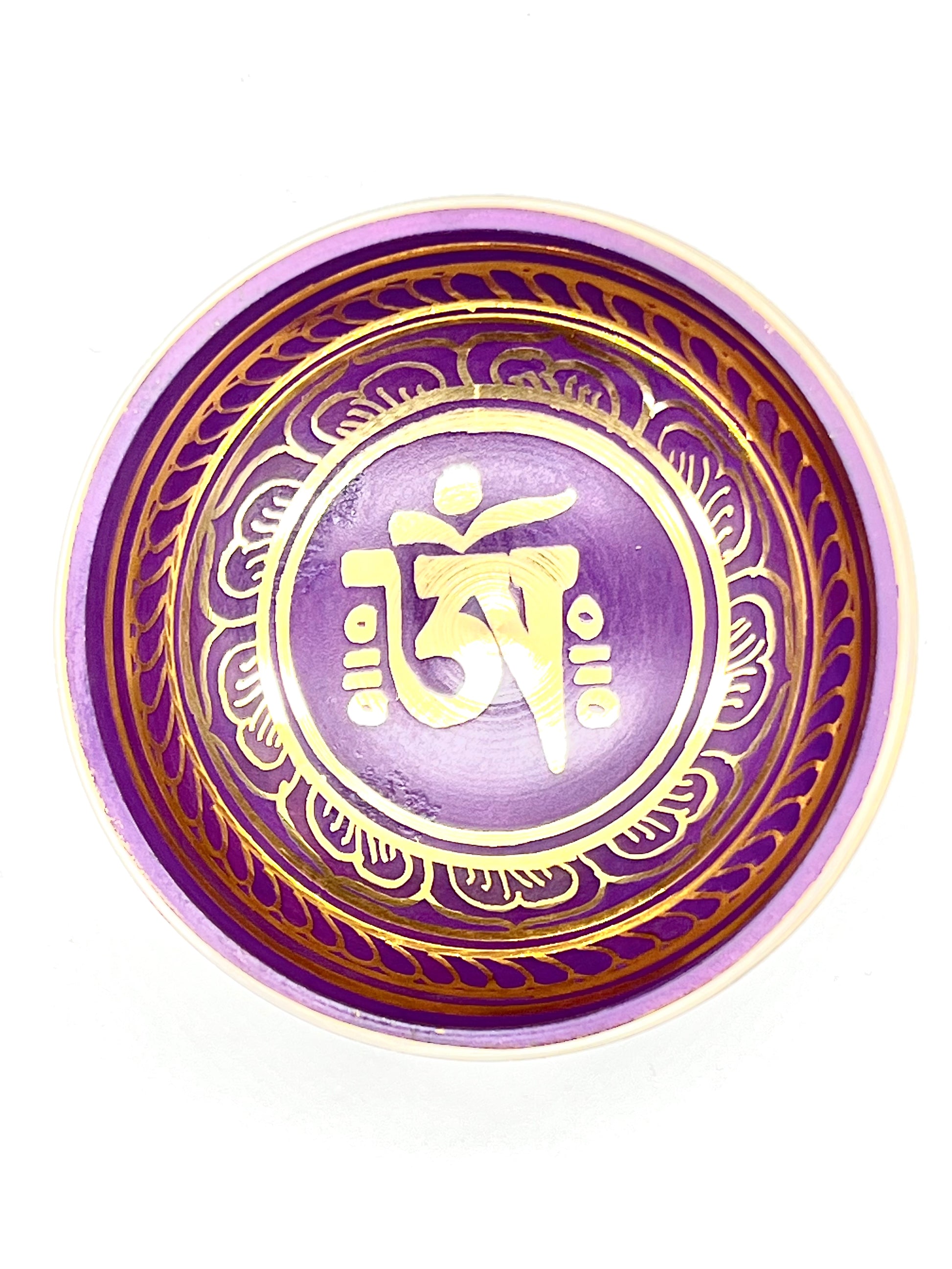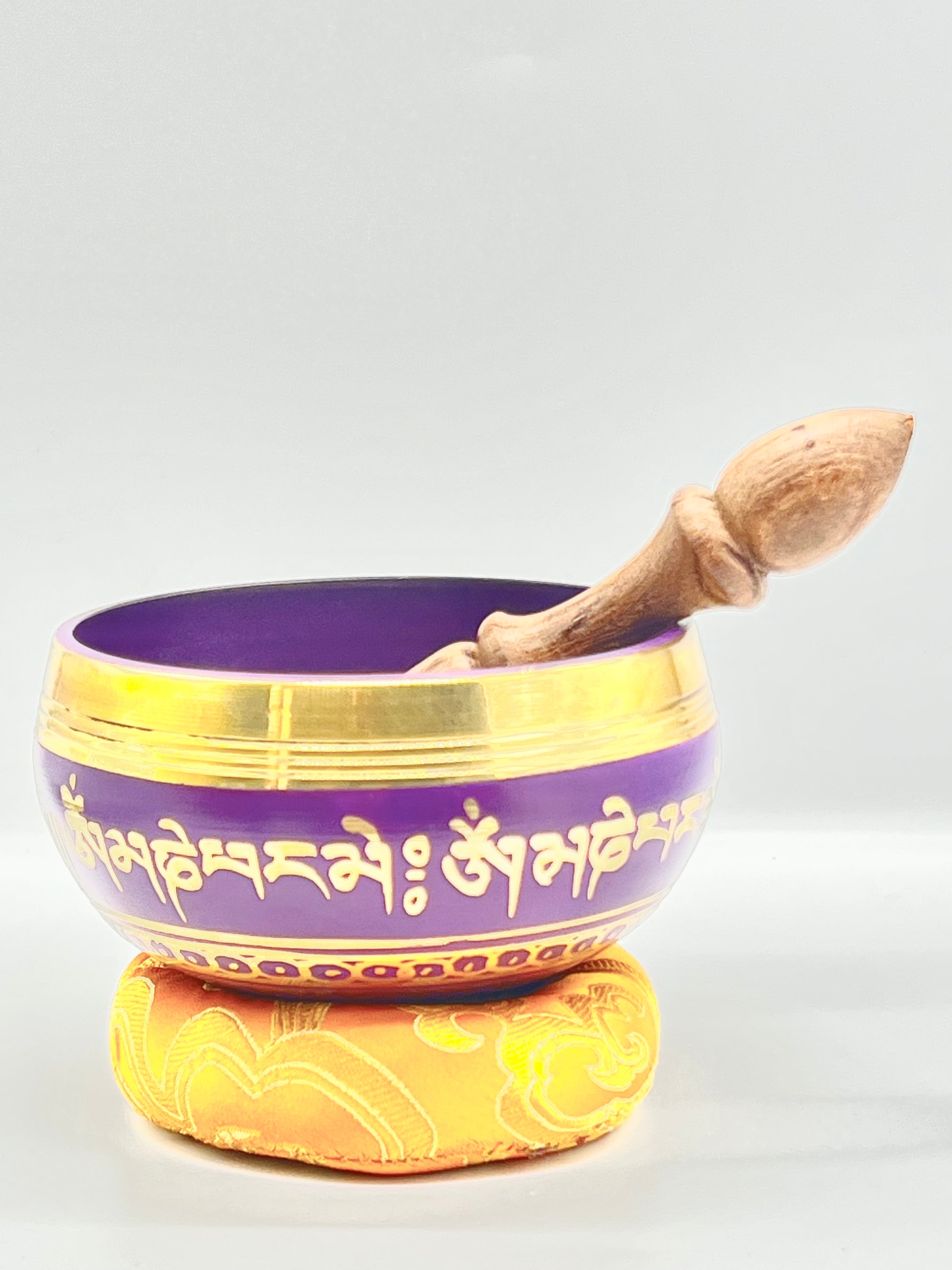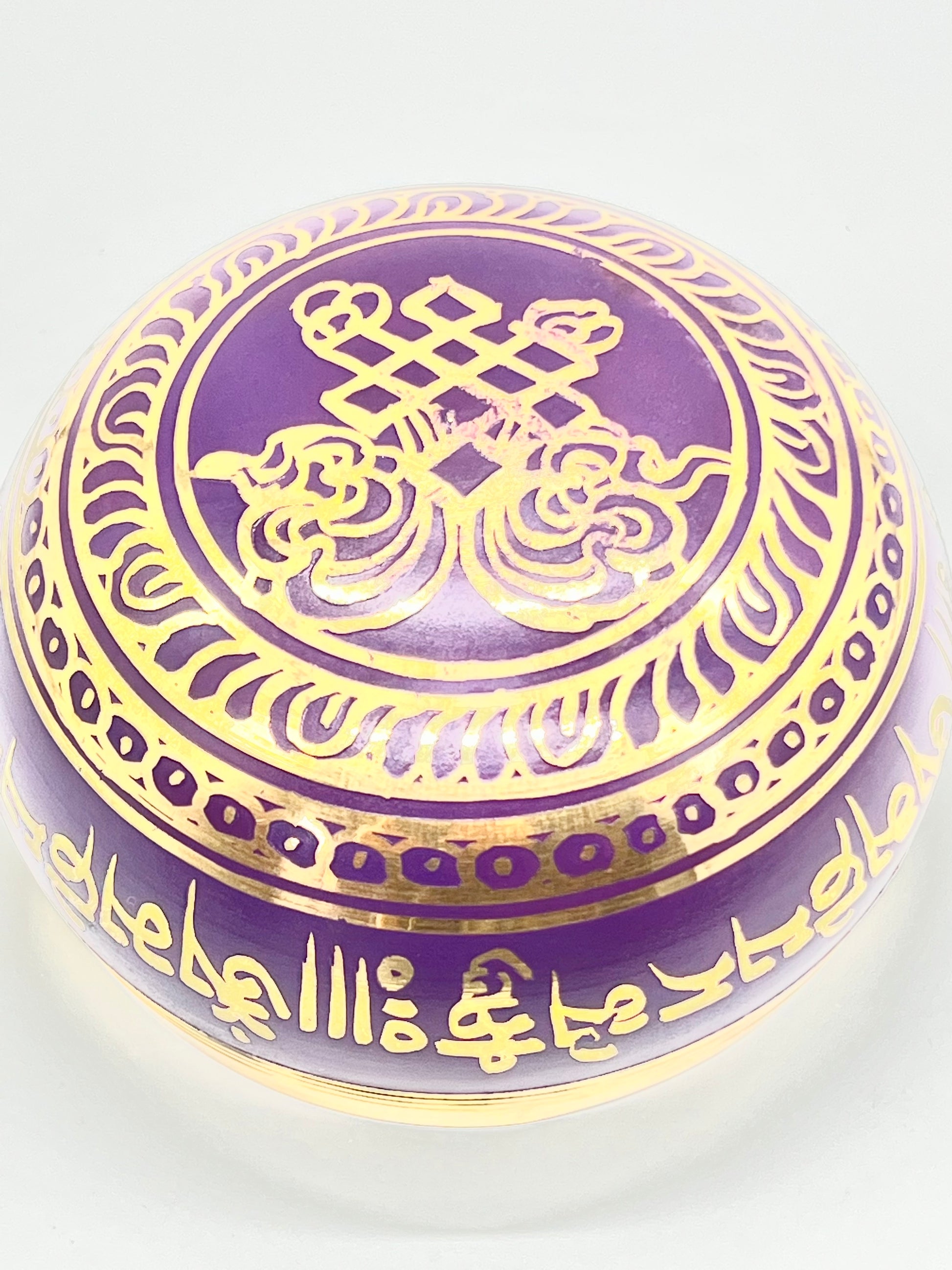 Purple hand painted singing bowl with Tibetan Om syllable inside, Eternal knot design on the under and Tibetan compassion mantra ( Om mani padme hum) hand painted on outside.
