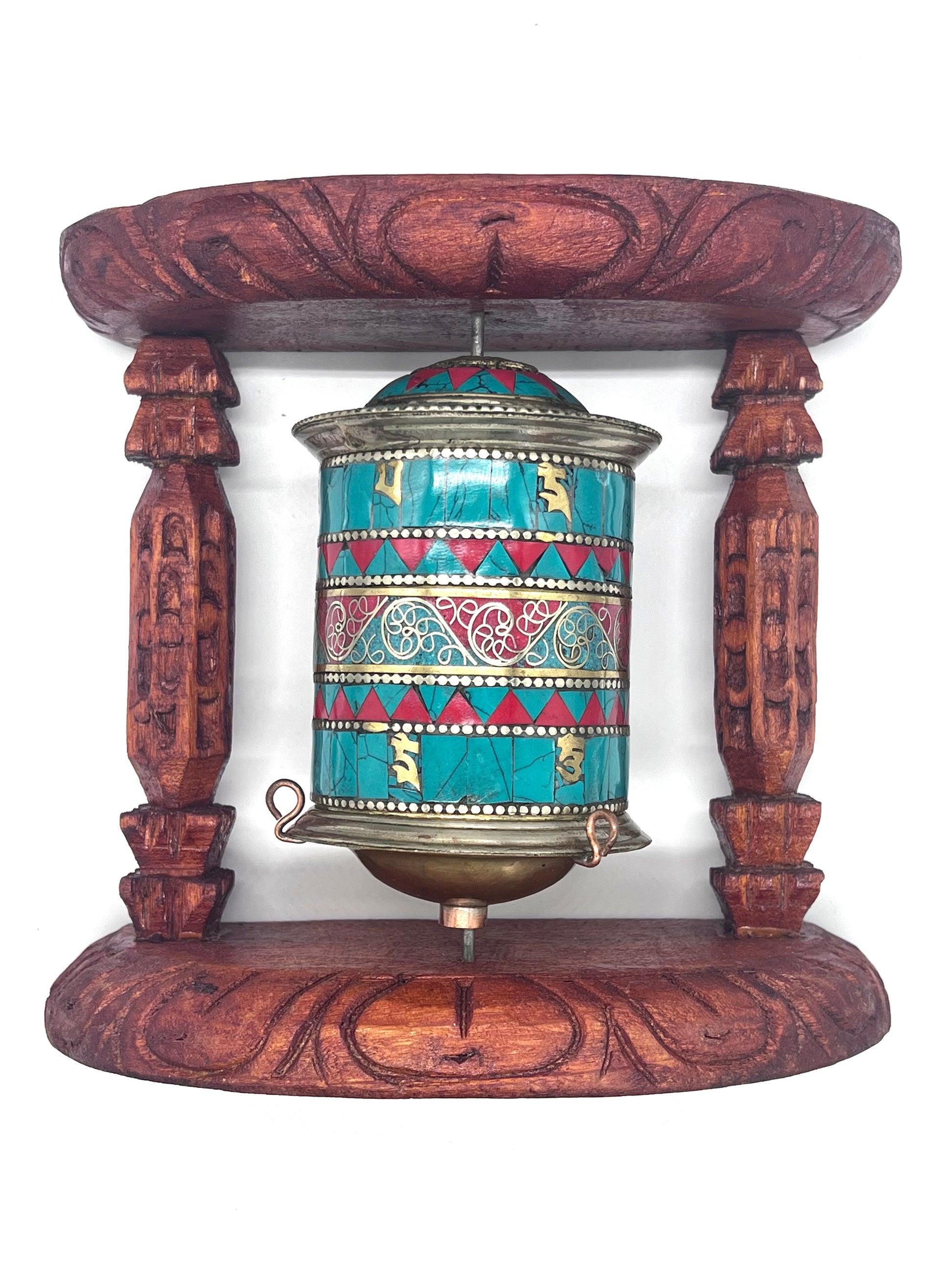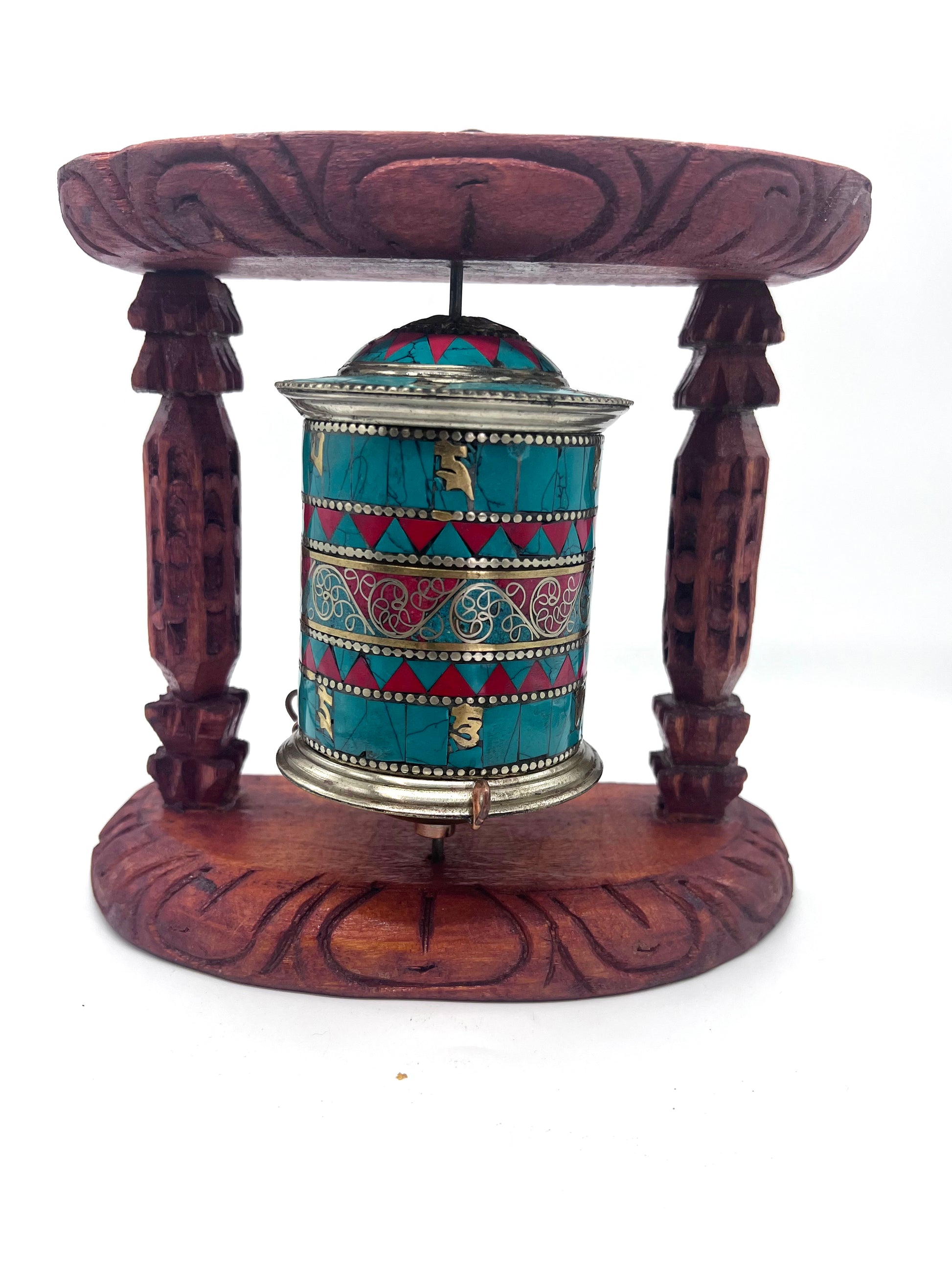 Stone inlaid Tibetan Prayer Wheel with Wooden Frame